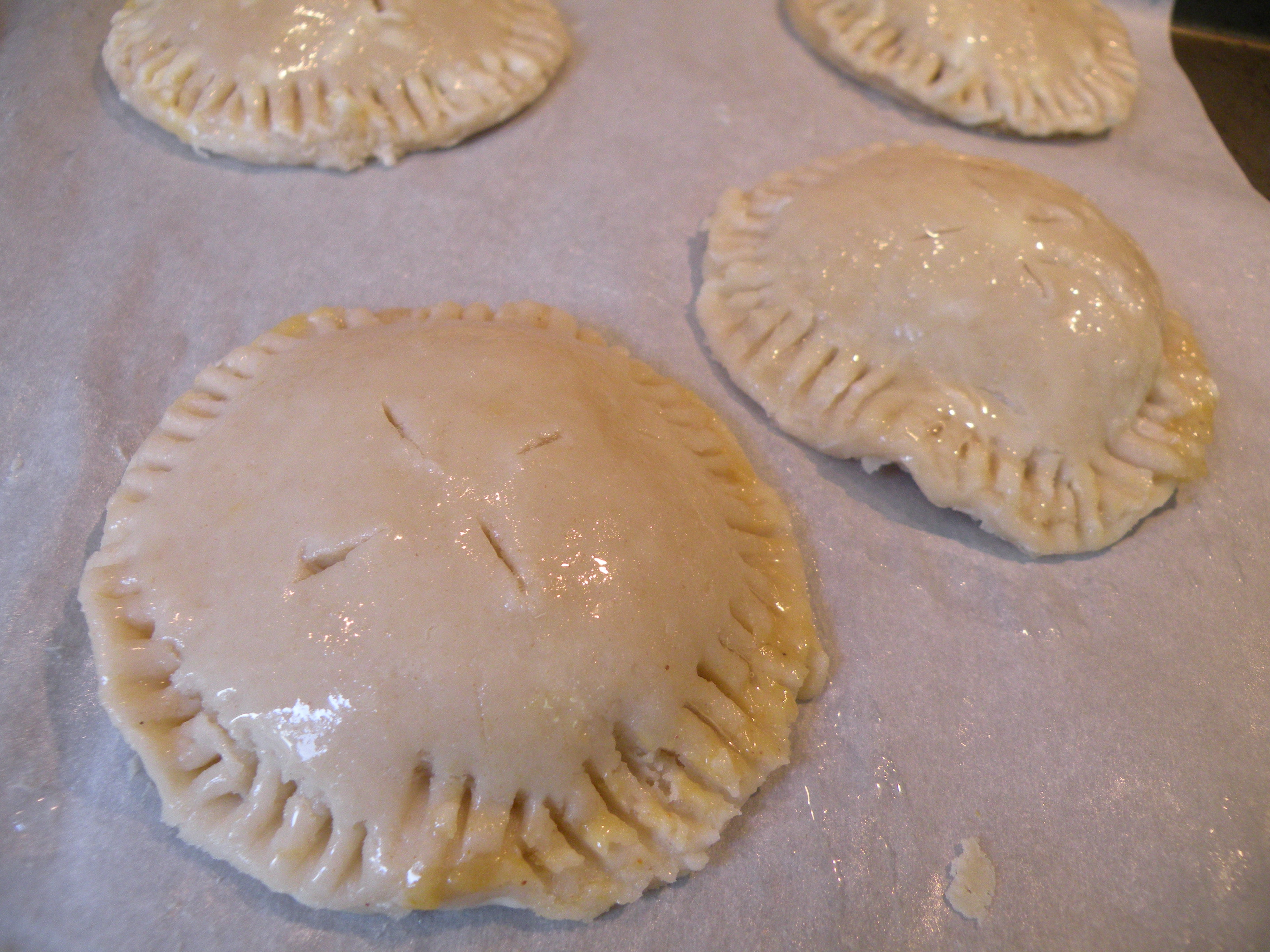 Take chilled hand pies out of fridge and make a slit on the top of each with a sharp knife. This is important because it lets the steam out as they cook. Baste each pie with an egg wash (1 egg white whisked thoroughly with 1 T of water). The egg wash will help seal any delicate cracks in the dough. If you want to do sanding sugar instead of glaze, sprinkle pies with sanding sugar.