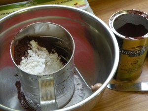 Sift together the flour, cocoa, baking soda, powder and salt. I love using the hand-held sifter that I bought at the grocery store. You just dump everything in, turn the handle and it all gets sifted together.