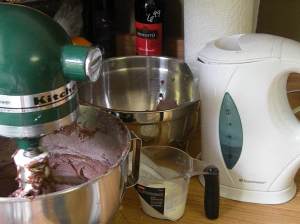 Starting with the dry ingredients, add the flour mixture and then alternate with the buttermilk. You want to begin and end with the dry ingredients. Be sure to have a rubber spatula handy so you can continue to scrape the sides of the bowl. Continuing on low speed, add the boiling water (I keep an electric kettle handy). The batter will be pretty thin at this point. Remove the bowl and using your rubber spatula, fold in the chocolate chips. Divide the batter between the two pans and make on the center rack for 25-30 minutes or until a toothpick inserted comes out clean.