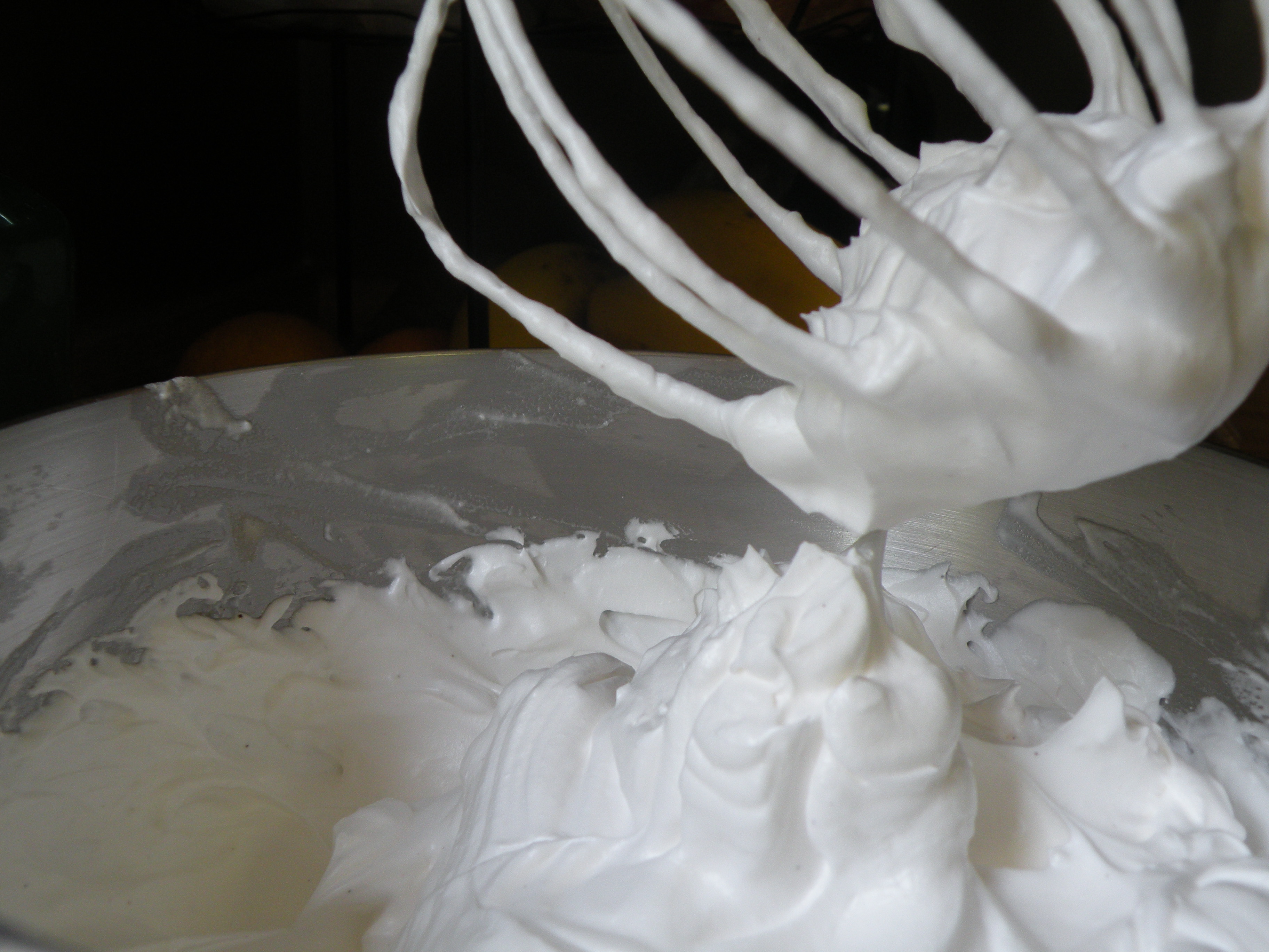 This is the tricky part. You want to try to time the egg whites with the temperature of the syrup. So, when the syrup reaches 230 degrees (I found 230 to work the best for me), begin beating the egg whites to stiff, shiny peaks. Once the syrup reaches 242, carefully pour the mixture into the egg whites while beating on medium speed. Try your best not to let the syrup touch the sides or the whisk attachment. Add the vanilla and continue to beat for about 5 minutes or until the frosting reaches room temperature. This is a good time to prep your cake layers and get ready to assemble.