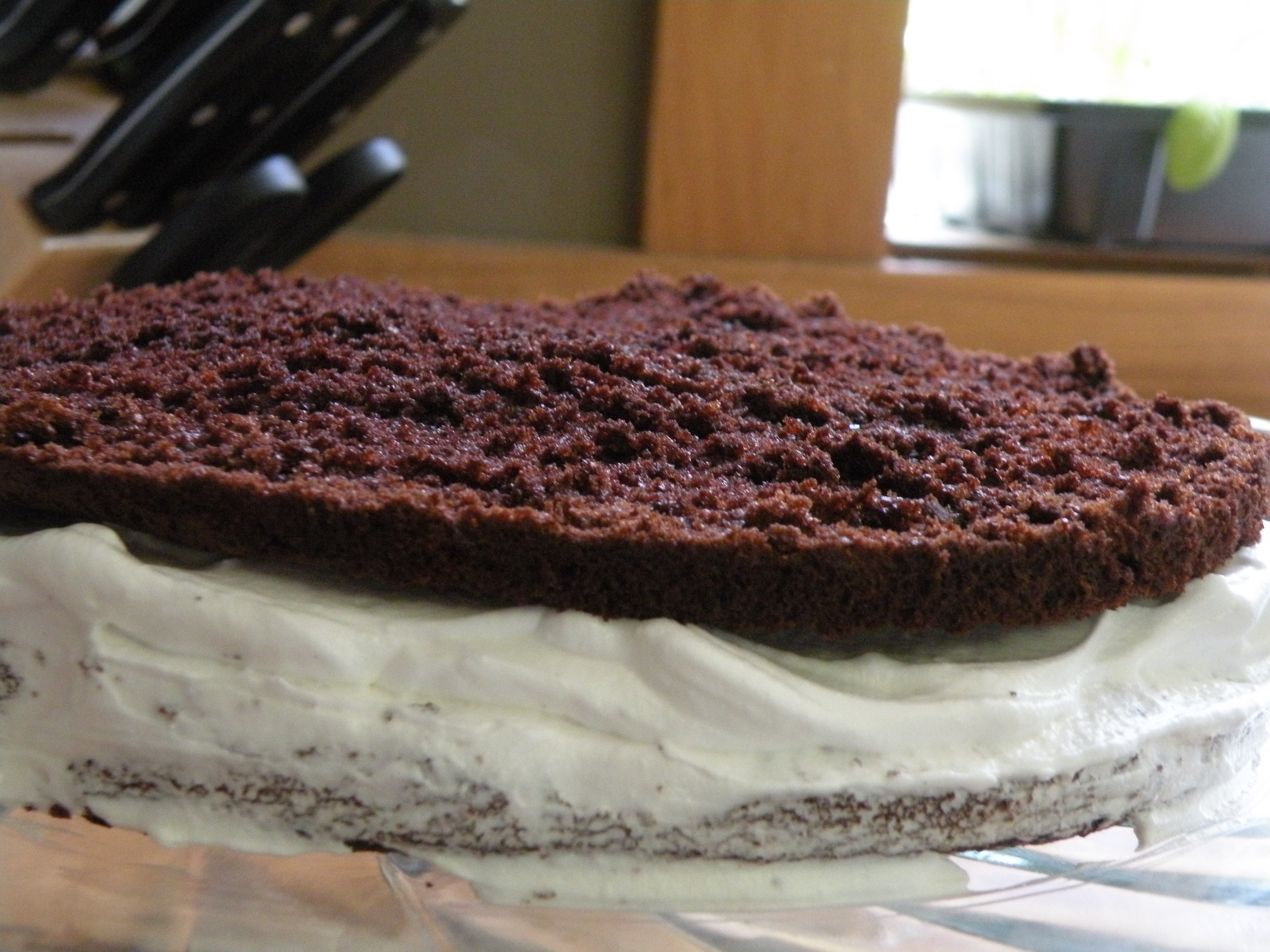 Put the bottom layer cut side up on a cake round or platter. Cover it generously with frosting (you can probably be more generous than you think). Top with the second layer cut side up and frost away.