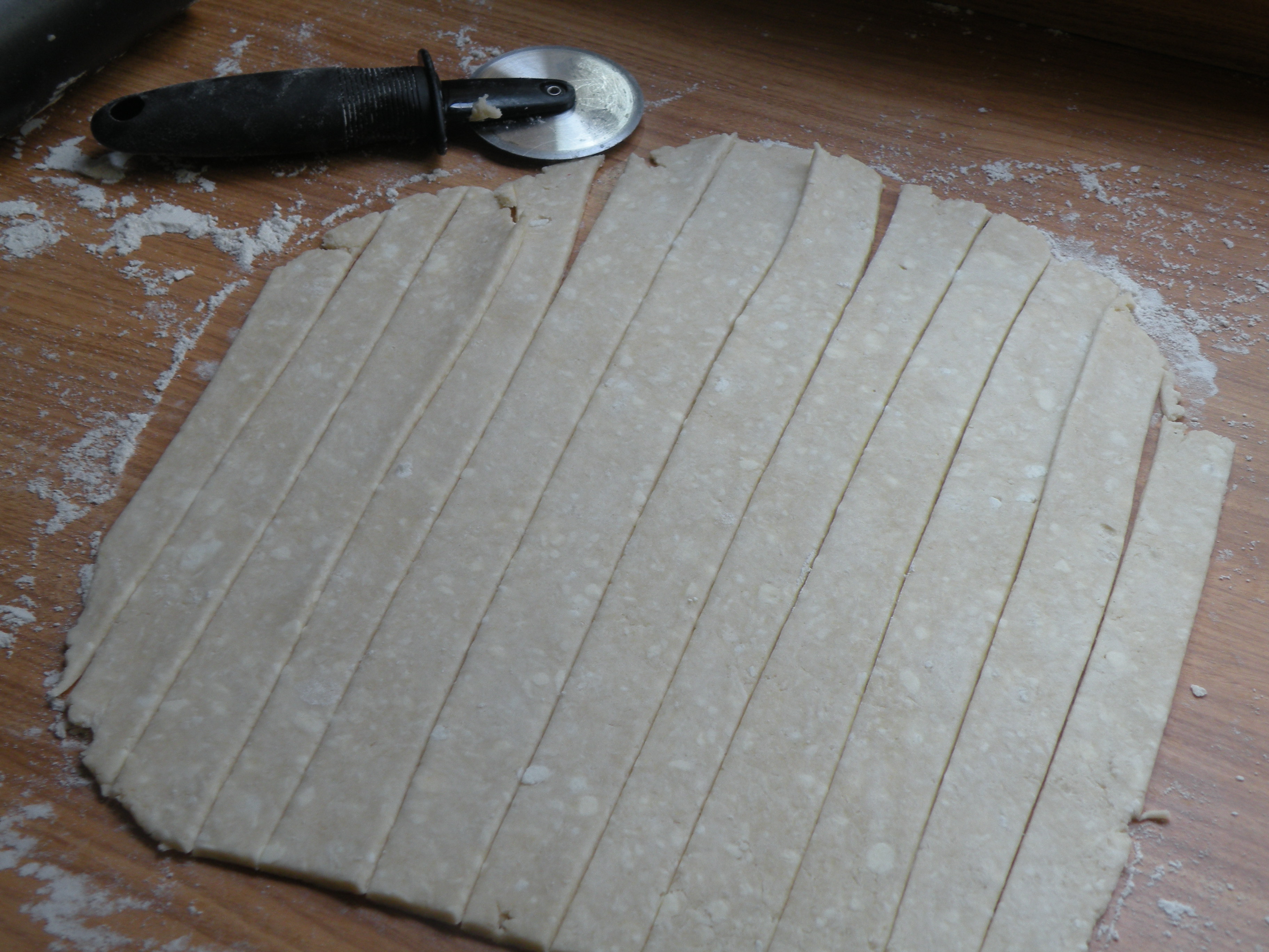 Line a baking sheet with parchment or wax paper. Roll the other circle of dough into a 1/4 inch thick circle. Using a pizza cutter or sharp knife, cut circle into 12 strips about one inch wide.