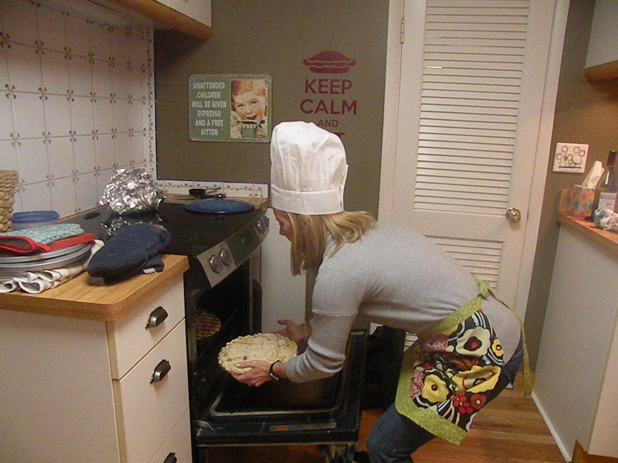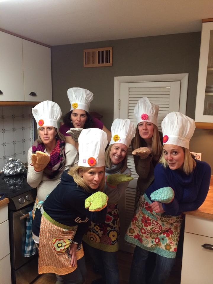 The self-taught student has become the teacher!  This past weekend I hosted five friends for my first pie clinic.  My pie-making has hit a bit of a plateau, so the idea of teaching others to make pie was just the infusion of energy I needed.  Five women, three food processors, hand made aprons, hand made oven mitts, chef hats and wine for everyone made this pie clinic a memorable one!